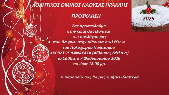 Ο Αθλητικός Όμιλος Ενόργανης Γυμναστικής της Νάουσας «ΗΡΑΚΛΗΣ» σας προσκαλεί στην κοπή της βασιλόπιτάς του που θα γίνει στην Αίθουσα Διαλέξεων του Πολυχώρου Πολιτισμού «ΧΡΗΣΤΟΣ ΛΑΝΑΡΑΣ» (Αίθουσες Βέτλανς).Το Σάββατο 7 Φεβρουαρίου 2026 και ώρα 18.00 μμ.