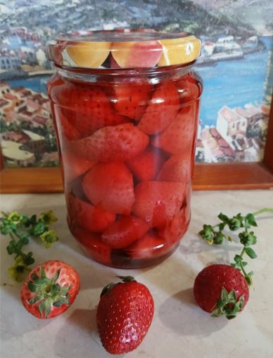 Αφού κρυώσει και αφαιρέσουμε τις φράουλες, αναμιγνύουμε το σιρόπι με το αλκοόλ και το τοποθετούμε σε γυάλινα μπουκάλια.