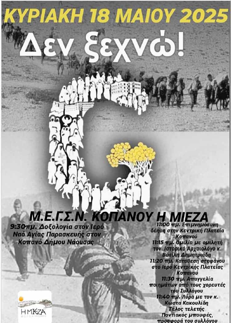 Ο Μ.Ε.Γ.Σ.Ν. ΚΟΠΑΝΟΥ «Η ΜΙΕΖΑ» σας προσκαλεί στην Δοξολογία για την Ημέρα Μνήμης της Γενοκτονίας των Ελλήνων του Πόντου της 19ης Μαϊου, που θα πραγματοποιηθεί την Κυριακή 18 Μαϊου και ώρα 9:30 πμ. στον Ιερό Ναό Αγίας Παρασκευής στον Κοπανό Δήμου Νάουσας.