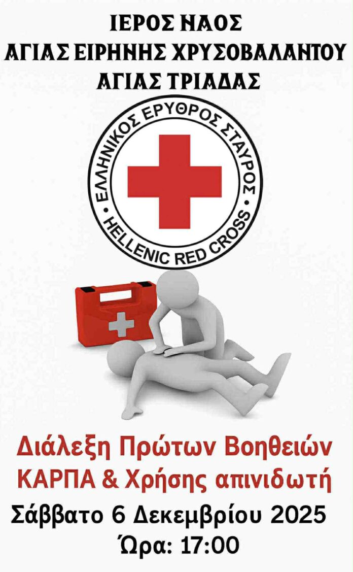 Μία σημαντική δράση ενημέρωσης και εκπαίδευσης θα πραγματοποιήσουμε το Σάββατο 6 Δεκεμβρίου 2025, στις 17:00, στον Ιερό Ναό Αγίας Ειρήνης Χρυσοβαλάντου στην Αγία Τριάδα Ημαθίας, σε συνεργασία με τον Ελληνικό Ερυθρό Σταυρό!
