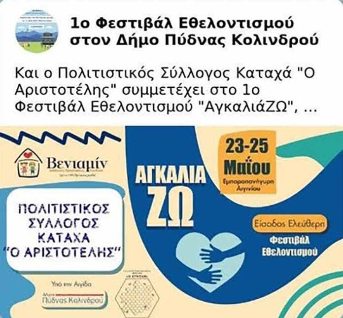 Στο 1ο Φεστιβάλ Εθελοντισμού «ΑγκαλιάΖΩ» θα συμμετέχουν μεταξύ πολλών άλλων: Η Δημοτική Κοινότητα Καταχά, η Κοινοτική Βιβλιοθήκη Καταχά «Ο ΒΗΣΑΡΙΩΝ» & ο Πολιτιστικός Σύλλογος Καταχά «Ο ΑΡΙΣΤΟΤΕΛΗΣ».