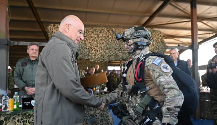 Το σαφές μήνυμα ότι οι Ένοπλες Δυνάμεις της Ελλάδας «έχουν μπει στη νέα εποχή, όχι μόνο με το δεξί, αλλά και με τα δύο πόδια» υπογράμμισε ο υπουργός Εθνικής Άμυνας Νίκος Δένδιας, σήμερα, από το πεδίο βολής «Αετός» όπου διεξάγεται η άσκηση «Αίσιος Οιωνός – 25» με τη συμμετοχή drone και anti-drone συστημάτων.