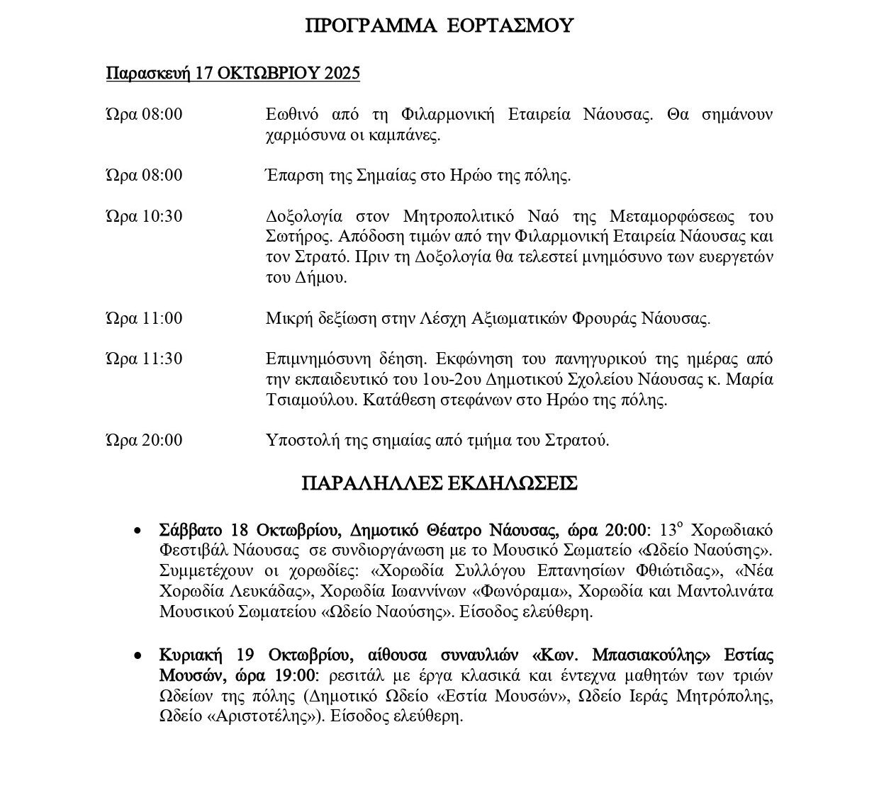 Ο Δήμαρχος Ηρωικής Πόλης Νάουσας κ. Νικόλαος Κουτσογιάννης σας προσκαλεί να παραστείτε στις εκδηλώσεις για την 113η Επέτειο Απελευθέρωσης της Νάουσας από τον τουρκικό ζυγό (17 Οκτωβρίου 2025), οι οποίες θα πραγματοποιηθούν σύμφωνα με το παρακάτω πρόγραμμα: