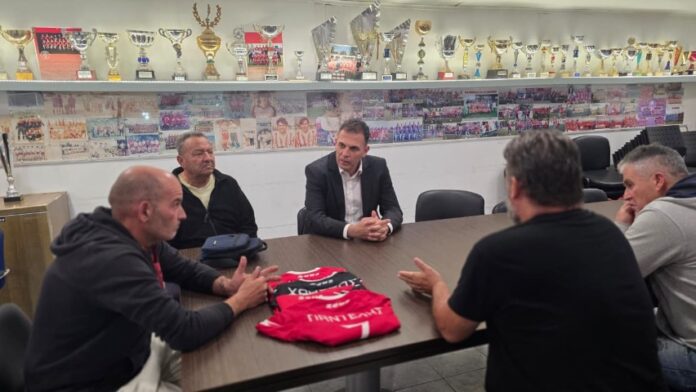 Στη συνέχεια ο κ. Καραμέρος επισκέφθηκε την ακαδημία ποδοσφαίρου, «ΑΟ Κόκκινος Μύλος» και συνομίλησε με τον προπονητή Αντώνη Σουλακέλη καθώς και με γονείς των νεαρών αθλητών για τα προβλήματα που αντιμετωπίζει η περιοχή του Κόκκινου Μύλου σε υποδομές.