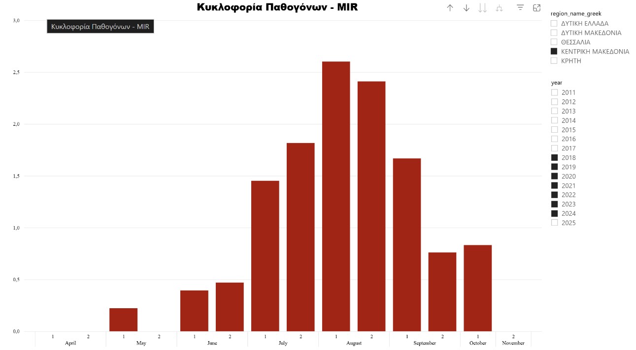 Σε ό,τι αφορά την παρουσία ιού του Δυτικού Νείλου σε κουνούπια, ο κ. Μουρελάτος ανέφερε: «Η παρουσία μολυσμένων κουνουπιών στο πεδίο, όπως αυτή εκφράζεται από τον δείκτη MIR για τα έτη 2018-2024, τυπικά ξεκινά τον Μάιο, αυξάνεται σταδιακά από τον Ιούνιο και τον Ιούλιο κάθε χρόνο και φτάνει στο μέγιστο τον Αύγουστο. Το γεγονός ότι φέτος για πρώτη φορά δεν έχει ανιχνευθεί παρουσία του ιού του Δυτικού Νείλου σε κουνούπια μέχρι τα μέσα του καλοκαιριού απαντά στο ερώτημα γιατί δεν έχουν καταγραφεί ανθρώπινα κρούσματα του ιού στην Περιφέρεια Κεντρικής Μακεδονίας έως σήμερα και προϊδεάζει για χαμηλό κίνδυνο μετάδοσης σε ανθρώπους για τη συνέχεια».