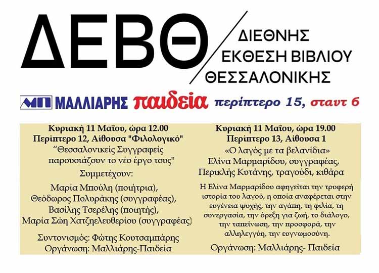 Κυριακή 11 Μαΐου, ώρα 12.00, Περίπτερο 12, Αίθουσα Φιλολογικό: “Θεσσαλονικείς Συγγραφείς παρουσιάζουν το νέο έργο τους”. Συμμετέχουν: Μαρία Μπούλη (ποιήτρια),Θεόδωρος Πολυράκης (συγγραφέας),Βασίλης Τσερέλης (ποιητής), Μαρία Σώη Χατζηελευθερίου (συγγραφέας). Συντονισμός: Φώτης Κουτσαμπάρης. Οργάνωση: Μαλλιάρης-Παιδεία.