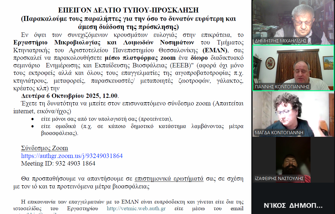 3.Το ΑΠΘ οργανώνει διαδικτυακή ενημέρωση για την ΒΙΟΑΣΦΑΛΕΙΑ στις 6 Οκτ 2025, στις 12.00 στο https://authgr.zoom.us/j/93249031864 (meeting ID: 932 4903 1864), Πληρ: κ Κ. Ευραιμίδης, 2310 999959, vetauthbio@gmail.com Στο δίωρο διαδικτυακό σεμινάριο Ενημέρωσης & Εκπαίδευσης Βιοασφάλειας-ΕΕΕΒ θα προσπαθήσουν να απαντηθούν επιστημονικά ερωτήματα των συμμετεχόντων σε σχέση με τον ιό και τα προτεινόμενα μέτρα βιοασφάλειας. Το σεμινάριο αφορά τόσο εκτροφείς όσο και όλους τους επαγγελματίες της αιγο-προβατοτροφίας πχ. Κτηνιάτρους, Μεταφορείς, Παρασκευαστές/Μεταποιητές ζωοτροφών, γάλακτος, κρέατος κλπ.