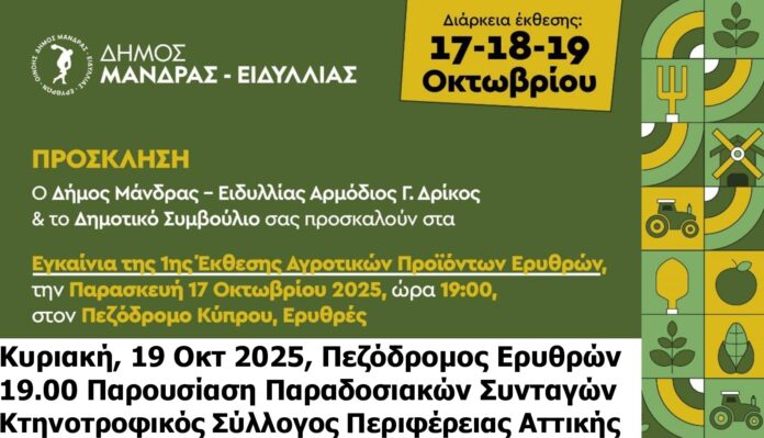 Ο Δήμαρχος Μάνδρας- Ειδυλλίας κ Α. Γ. Δρίκος (2132014972, gramdim@mandras-eidyllias.gr) δήλωσε: «Η γη των Ερυθρών κουβαλά ιστορία, παράδοση και ψυχή. Με τη 1η Έκθεση Αγροτικών Προϊόντων, εγκαινιάζουμε έναν θεσμό που ενώνει τις ρίζες μας με το μέλλον και αναδεικνύει τη δημιουργικότητα των ανθρώπων που παράγουν, καινοτομούν και προσφέρουν. Η Δημοτική μας Αρχή στηρίζει τον αγροτικό κόσμο με πράξεις – επενδύουμε στη γνώση, στη συνεργασία και στη βιώσιμη ανάπτυξη, γιατί πιστεύουμε ότι η γη μας έχει τη δύναμη να ξαναδώσει ζωή, προοπτική και υπερηφάνεια στον τόπο μας».