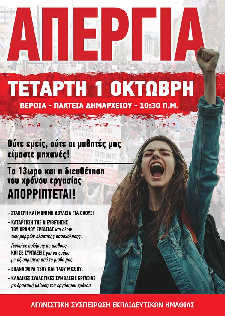 την 1η Οκτωβρίου κλείνουμε όλα τα σχολεία. Κατεβαίνουμε όλοι και όλες στον δρόμο, για εμάς, για τις οικογένειές μας, για τους μαθητές μας. Υπερασπιζόμαστε τη ζωή και την αξιοπρέπειά μας! Στέλνουμε καθαρό μήνυμα: η πολιτική που μας γυρίζει στον μεσαίωνα, που μας καταδικάζει σε φτώχεια και εξάντληση, το νομοσχέδιο της κυβέρνησης για το 13ωρο, να πεταχτεί στα σκουπίδια.