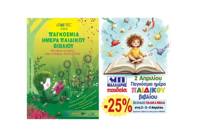 Με αφορμή την Παγκόσμια Ημέρα Παιδικού Βιβλίου (2 Απριλίου), τα βιβλιοπωλεία Μαλλιάρης-Παιδεία διοργανώνουν ένα τριήμερο προσφορών, με μειωμένες τιμές -25% σε όλα τα παιδικά βιβλία! (εκτός αυτών που εμπίπτουν στην ενιαία τιμή).