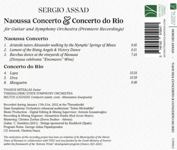 Το ψηφιακό άλμπουμ που πρόσφατα κυκλοφόρησε από την DaVinci Classics (Osaka/Japan)  με τίτλο “Naoussa Concerto & Concerto do Rio” σε μουσική του Sergio Assad (και τα δύο έργα σε πρεμιέρα) όχι μόνο τοποθετεί την πόλη της Νάουσας στον παγκόσμιο μουσικό χάρτη, αλλά ήδη προσφέρει σημαντικές διακρίσεις  για τη χώρα μας.