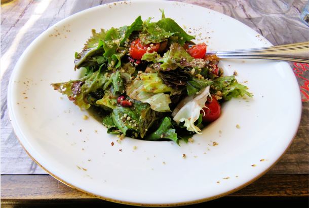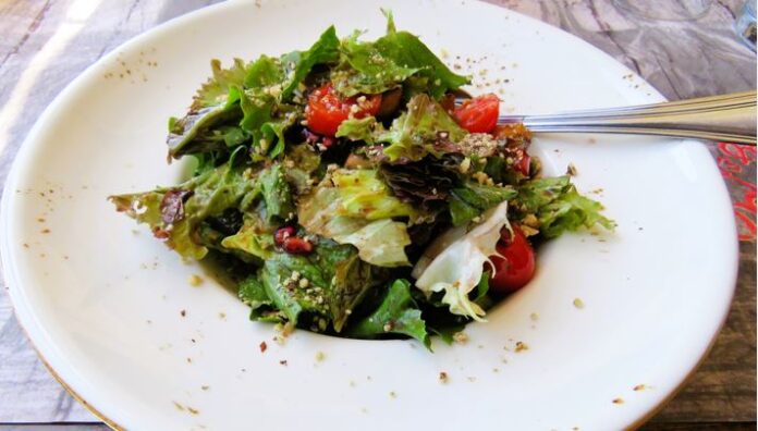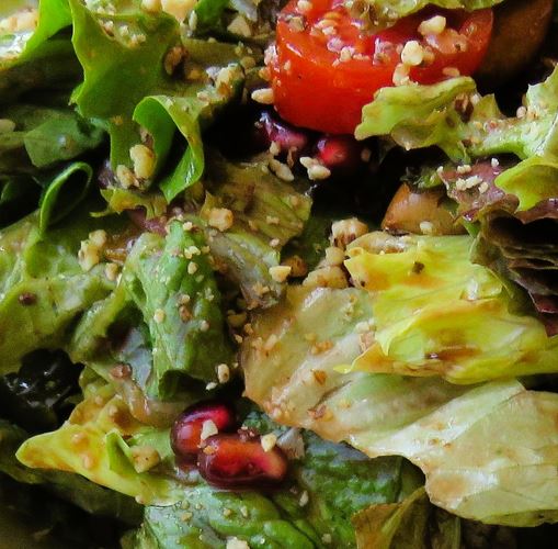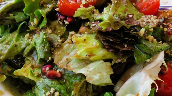 Πανδαισία πράσινης σαλάτας με ξηρούς καρπούς και ρόδι