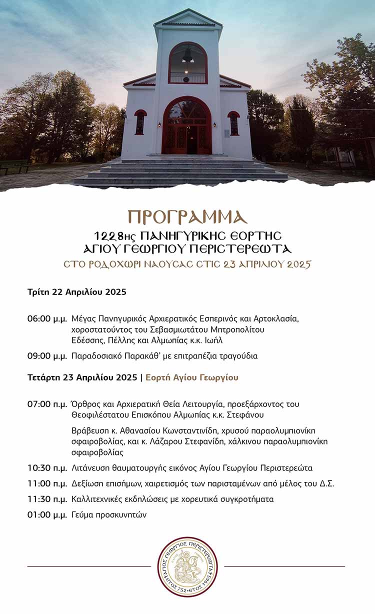 Πρόσκληση και πρόγραμμα για τον πανηγυρικό εορτασμό του Αγίου Γεωργίου Περιστερεώτα.