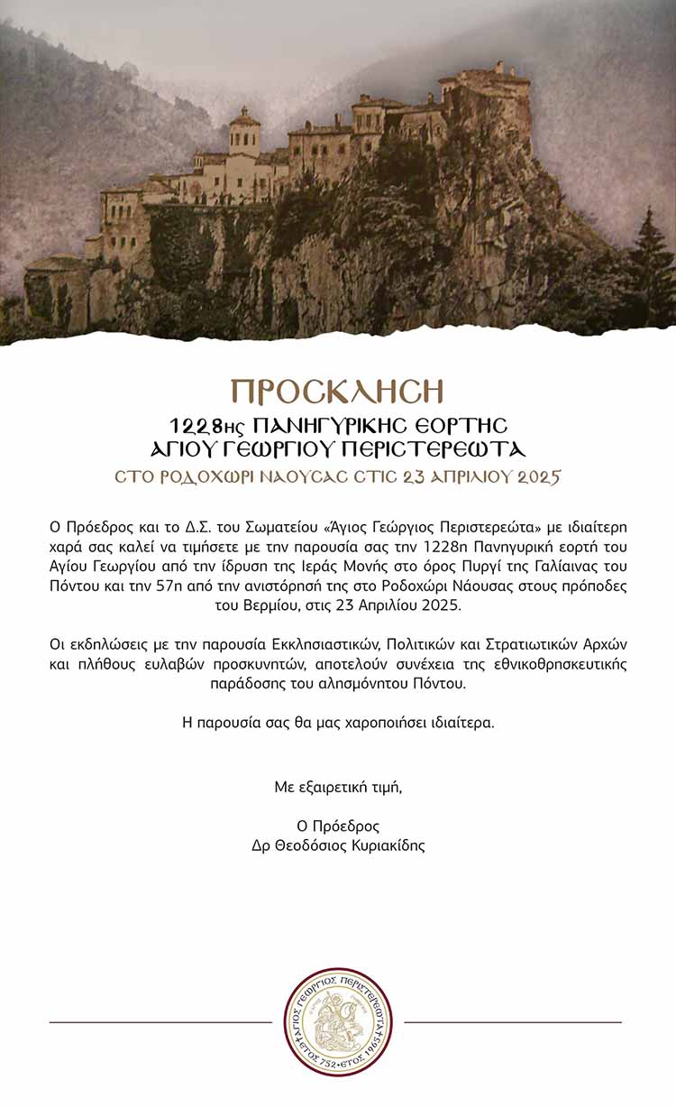 Πρόσκληση και πρόγραμμα για τον πανηγυρικό εορτασμό του Αγίου Γεωργίου Περιστερεώτα.