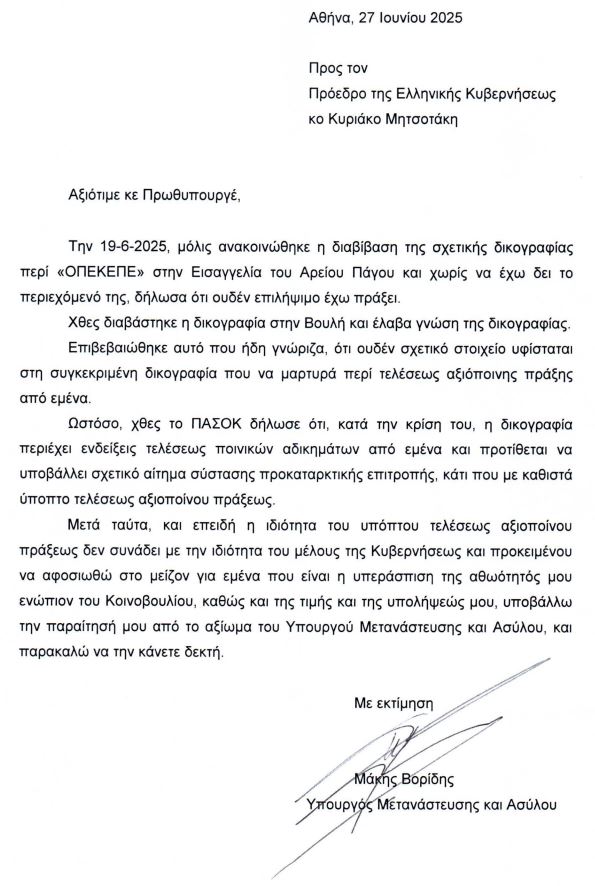 «Ανακοινώνεται ότι ο υπουργός Μετανάστευσης και Ασύλου Μάκης Βορίδης υπέβαλε την παραίτησή του στον Πρωθυπουργό, για τους λόγους που αναφέρονται στην επιστολή και η οποία επισυνάπτεται. Ο Πρωθυπουργός έκανε δεκτή την παραίτησή του.