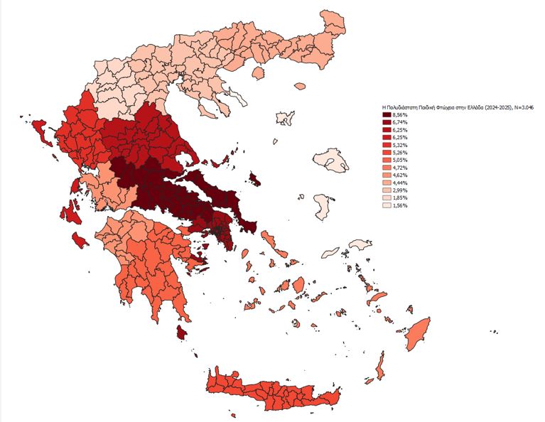 Η Στερεά Ελλάδα καταγράφει το υψηλότερο ποσοστό πολυδιάστατης παιδικής φτώχειας (8,56%), με οριακή στατιστική σημαντικότητα, ενώ ακολουθούν οι Περιφέρειες Αττικής, Θεσσαλίας και Ιονίων Νήσων.