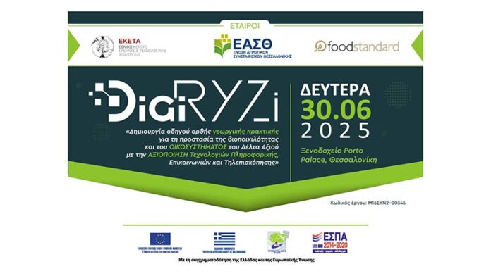 Την Δευτέρα 30 Ιουνίου 2025 πραγματοποιήθηκε εκδήλωση στο ξενοδοχείο Porto Palace στη Θεσσαλονίκη, για την παρουσίαση των αποτελεσμάτων του έργου DigiRyzi, με τίτλο “Δημιουργία οδηγού ορθής γεωργικής πρακτικής για την προστασία της βιοποικιλότητας και του οικοσυστήματος του Δέλτα Άξιου με την Αξιοποίηση Τεχνολογιών Πληροφορικής, Επικοινωνιών και Τηλεπισκόπησης”. Το έργο υλοποιήθηκε στο πλαίσιο του Μέτρου 16 του Προγράμματος Αγροτικής Ανάπτυξης 2014-2020, με τη συγχρηματοδότηση της Ελλάδας και της Ευρωπαϊκής Ένωσης.