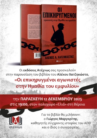 Οι εκδόσεις “Ατεχνως” σας προσκαλούν στην παρουσίαση του νέου βιβλίου του Ημαθιώτη δημοσιογράφου-συγγραφέα Αλέκου Χατζηκώστα “Οι επικηρυγμένοι αγωνιστές στην Ημαθία του Εμφυλίου” που θα γίνει την Παρασκευή 12 Δεκέμβρη στις 7μ.μ στον πολυχώρο “ΕΛΙΑ” στη Βέροια.