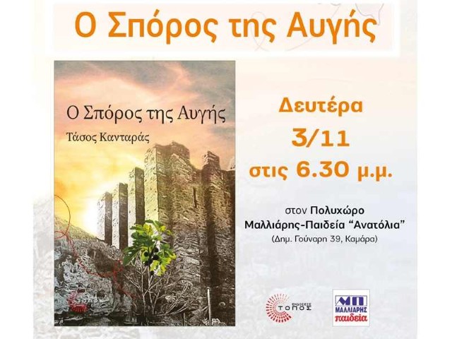 Το νέο μυθιστόρημα του Τάσου Κανταρά με τίτλο “O Σπόρος της Αυγής” (εκδόσεις Τόπος) παρουσιάζεται την Δευτέρα 3 Νοεμβρίου, στις 6.30 μ.μ. στον Πολυχώρο Μαλλιάρης-Παιδεία “Ανατόλια” (Δημ. Γούναρη 39, Καμάρα).