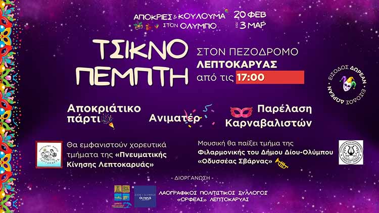 Στον πεζόδρομο της Λεπτοκαρυάς θα δοθεί το απόγευμα της Τσικνοπέμπτης 20 Φεβρουαρίου 2025 (ώρα 17:00) το σήμα εκκίνησης των φετινών αποκριάτικων εκδηλώσεων του Δήμου Δίου-Ολύμπου.
