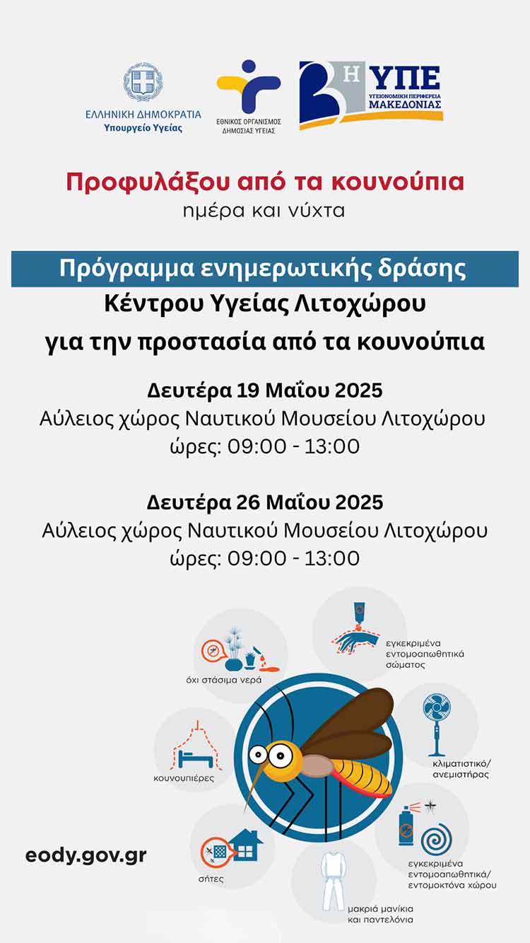 Στο πλαίσιο της ενημέρωσης των πολιτών για τις μεθόδους προστασίας και προφύλαξης από τα κουνούπια, το Κέντρο Υγείας Λιτοχώρου διοργανώνει πρόγραμμα ενημερωτικής δράσης.