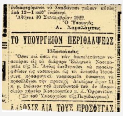 Μία αγγελία στις εφημερίδες της εποχής καλεί τους πρόσφυγες επιγόνους του Ιπποκράτη, να προσέλθουν και να αναλάβουν καθήκοντα στα νοσοκομεία της χώρας, όπου το επιστημονικό προσωπικό δεν επαρκεί για τις τρέχουσες ανάγκες. Σχεδόν ταυτόχρονα δημοσιεύεται και δεύτερη αγγελία: «Όσοι και όσες εκ των διατελεσάντων νοσοκόμοι εις τα διάφορα ελληνικά νοσοκομεία της Μ. Ασίας επιθυμούσι να προσληφθώσιν ως νοσοκόμοι εις τα ενταύθα ιδρυόμενα προσφυγικά νοσοκομεία, δύνανται να προσέλθωσι την προσεχήν Δευτέραν και ώραν 11 π.μ….. (εκ του Υπουργείου της Περιθάλψεως)».