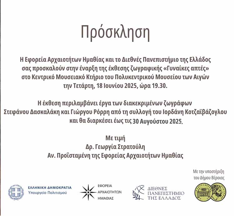 Η Εφορεία Αρχαιοτήτων Ημαθίας και το Διεθνές Πανεπιστήμιο της Ελλάδος παρουσιάζουν την εικαστική έκθεση «Γυναίκες Απτές» στις 18 Ιουνίου 2025, στις 19:30, στο Κεντρικό Μουσειακό Κτήριο του Πολυκεντρικού Μουσείου των Αιγών.