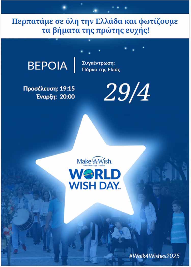 Η 29η Απριλίου – η Παγκόσμια Ημέρα Ευχής – είναι ημερομηνία ορόσημο για το Make-A-Wish παγκοσμίως και η επέτειος του εορτασμού της εκπλήρωσης της 1ης ευχής, του Chris που, 45 χρόνια πριν, έγινε αστυνομικός για μία ημέρα και αποτέλεσε πηγή έμπνευσης για τη δημιουργία του οργανισμού. Η μέρα αυτή, κάθε χρόνο, γιορτάζεται σε 50 χώρες σε όλο τον κόσμο με ιδιαίτερο έως και φαντασμαγορικό, σε κάποιες περιπτώσεις, τρόπο. Στην Ελλάδα, θα τη γιορτάσουμε με μια εβδομάδα διαδοχικών περιπάτων που θα ξεκινήσουν από την Αθήνα στις 26 Απριλίου, δίνοντας τη «σκυτάλη» στις επόμενες πόλεις έως τις 3 Μαΐου, στη Θεσσαλονίκη.