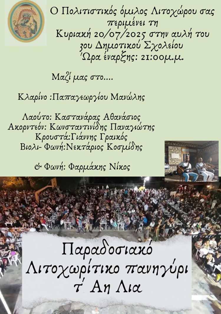 - Κυριακή 20 Ιουλίου “Παραδοσιακό Λιτοχωρίτικο Πανηγύρι τ’ Αη Λια”