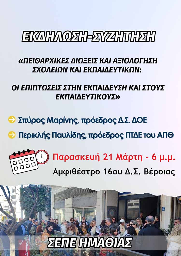 Το Δ.Σ. του ΣΕΠΕ Ημαθίας σας προσκαλεί να συμμετέχετε στην εκδήλωση που διοργανώνει ο Σύλλογος μας την Παρασκευή 21 Μαρτίου, στις 6 μ.μ. στο αμφιθέατρο του 16ου Δ.Σ. Βέροιας, με θέμα «Πειθαρχικές διώξεις και Αξιολόγηση σχολείων και εκπαιδευτικών: Οι επιπτώσεις στην εκπαίδευση και στους εκπαιδευτικούς», με ομιλητές τον Σπύρο Μαρίνη (Πρόεδρος ΔΟΕ) και τον Περικλή Παυλίδη (Πρόεδρος του ΠΤΔΕ του ΑΠΘ).