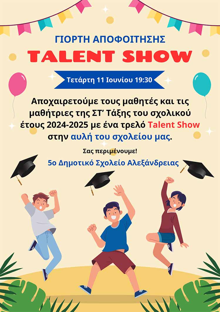 Αλεξάνδρεια Πρόσκληση σε εκδήλωση του 5ου Δημοτικού Σχολείου Αλεξάνδρειας Από Έμβολος - 11/06/2025 Πρόσκληση σε εκδήλωση του 5ου Δημοτικού Σχολείου Αλεξάνδρειας