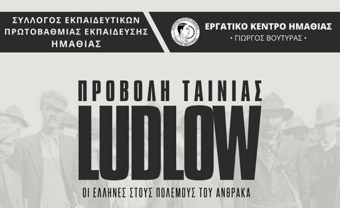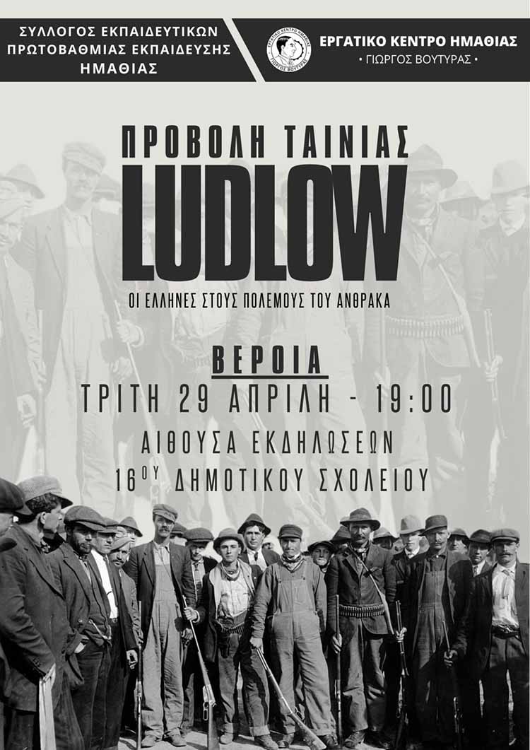 Ο Σύλλογος Εκπαιδευτικών Πρωτοβάθμιας Εκπαίδευσης Ημαθίας στα πλαίσια του εορτασμού της Εργατικής Πρωτομαγιάς συνδιοργανώνει σε συνεργασία με το Εργατικό Κέντρο Ημαθίας την Τρίτη 29 Απριλίου 2025, στις 7 μ.μ., στο Αμφιθέατρο του 16ου Δημοτικού Σχολείου Βέροιας προβολή του ντοκιμαντέρ «Ludlow, οι Έλληνες στους Πολέμους του Άνθρακα».