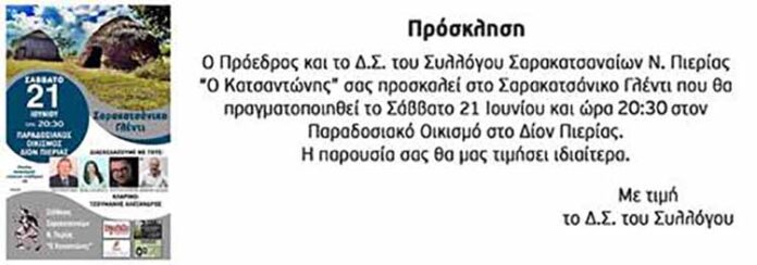 Πολιτιστικά Πρόσκληση του Συλλόγου Σαρακατσαναίων Πιερίας “Ο Κατσαντώνης” για το Σαρακατσάνικο Γλέντι (21 Ιουνίου) Από Έμβολος - 17/06/2025 Πρόσκληση του Συλλόγου Σαρακατσαναίων Πιερίας “Ο Κατσαντώνης” για το Σαρακατσάνικο Γλέντι (21 Ιουνίου)