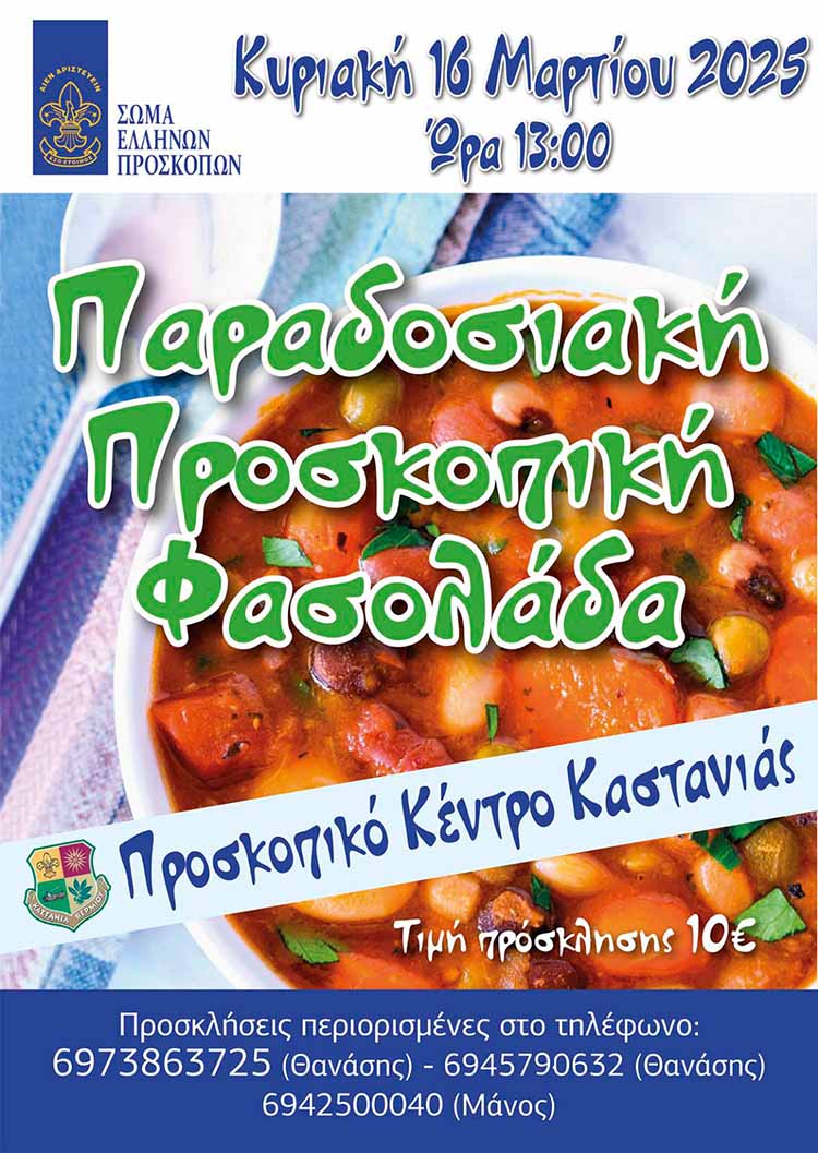 Την Κυριακή 16 Μαρτίου 2025 και ώρα 13.30 μ.μ. το Προσκοπικό Κέντρο Καστανιάς παραθέτει στις εγκαταστάσεις του γεύμα με ΠΑΡΑΔΟΣΙΑΚΗ ΠΡΟΣΚΟΠΙΚΗ ΦΑΔΟΛΑΔΑ.
