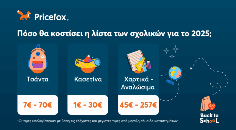 Το Pricefox, η κορυφαία πλατφόρμα σύγκρισης και αλλαγής παρόχων ενέργειας, έψαξε και βρήκε πόσο περίπου θα κοστίσουν* τα σχολικά είδη για τη φετινή σχολική χρονιά και μας δίνει συμβουλές για να εξοικονομήσουμε χρήματα.