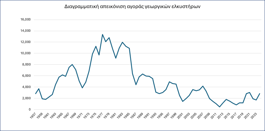 Παρά τα βελτιωμένα στοιχεία του 2024, η συνολική εικόνα του ελληνικού γεωργικού στόλου παραμένει ανησυχητική. Ο αριθμός των ενεργών ελκυστήρων εκτιμάται στις 130.000 μονάδες, με μέση ηλικία τα 23 έτη, γεγονός που υποδεικνύει σημαντική γήρανση και περιορισμένη αποδοτικότητα.