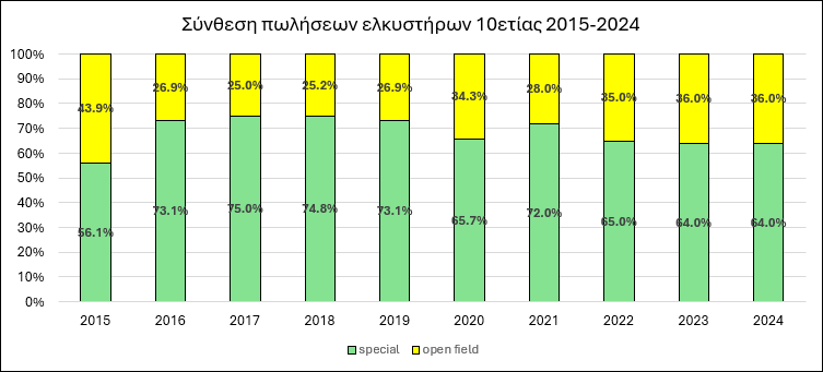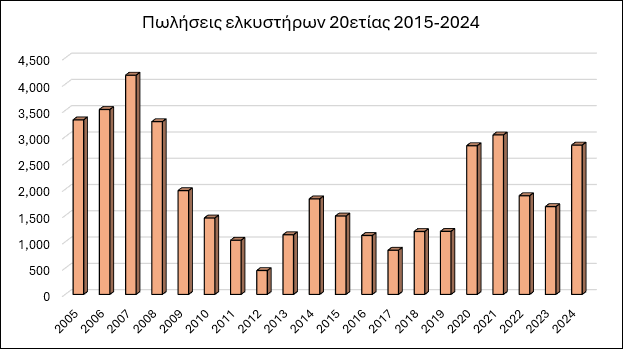 Σύμφωνα με τα επίσημα στοιχεία του Συνδέσμου Εισαγωγέων Αντιπροσώπων Μηχανημάτων (ΣΕΑΜ), οι πωλήσεις ελκυστήρων κατέγραψαν αύξηση, φτάνοντας τις 2.840 μονάδες, από 1.670 το 2023 — σημειώνοντας άνοδο 70%. Τα νούμερα αυτά αγγίζουν τις επιδόσεις των ετών 2020 και 2021, όπου οι πωλήσεις ανήλθαν σε 2.829 και 3.034 μονάδες αντίστοιχα.