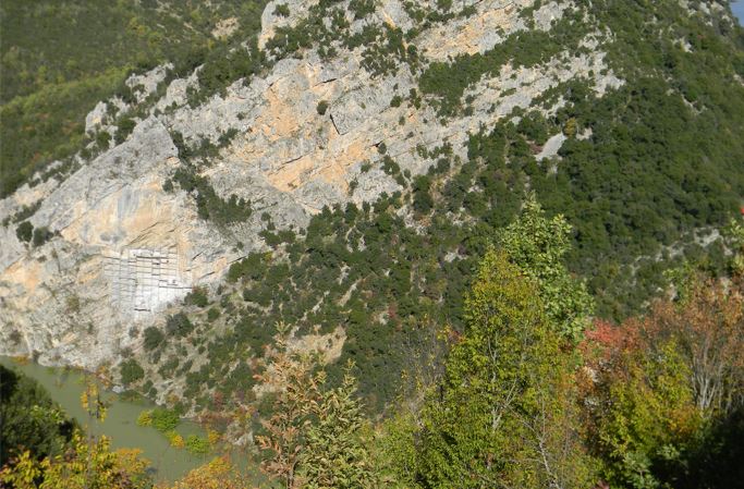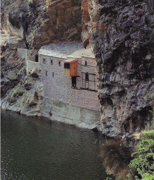 Σε μια βραχονησίδα, πάνω από τα γαλαζοπράσινα νερά του Αλιάκμονα, σκαλισμένο σε ένα βαθούλωμα του βράχου βρίσκεται ένα ασκηταριό με δύο στρώματα εντυπωσιακών τοιχογραφιών του 15ου και του 16ου αιώνα. Εκεί ασκήτεψε ο Άγιος Καλλίστρατος, ο πρώτος οικιστής του τόπου που ίδρυσε τη σκήτη του Αγίου Γεωργίου, αγίασε και έδωσε το όνομά του στο πέτρινο βουνό. Τον δρόμο της άσκησης στο ίδιο ακριβώς σημείο ακολούθησε αρκετά χρόνια αργότερα ο Άγιος Νικάνορας που κοιμόταν σε πέτρινο κρεβάτι για να μην ξεκουράζεται ποτέ, τρεφόταν με κάστανα και ρίζες από χόρτα και δεν άναβε ποτέ φωτιά για να ζεσταθεί.