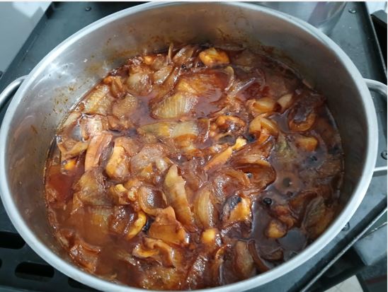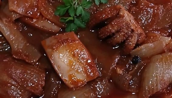 Τις αφαιρούμε και συνεχίζουμε ρίχνοντας πάλι ελαιόλαδο και τα κρεμμύδια στα τέσσερα κομμένα το σκόρδο και έπειτα τον πελτέ ντομάτας αραιωμένο.