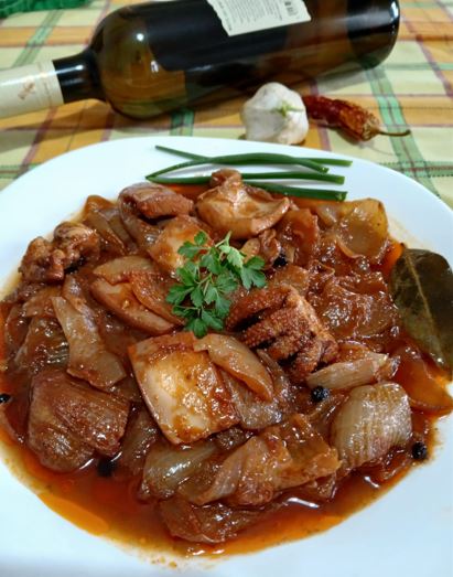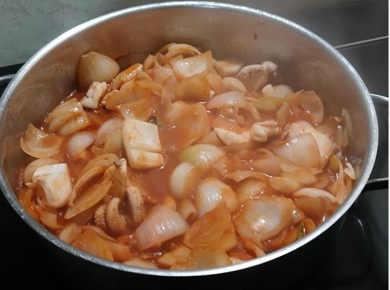 Αφού πάρει βράση προσθέτουμε τις σουπιές και τα υπόλοιπα υλικά δαφνόφυλλα, πιπέρι, γαρύφαλλο, ζάχαρη και καφτερό.