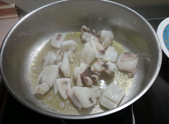 Αφού πλύνουμε τις σουπιές τις τεμαχίζουμε και στην κατσαρόλα με ελαιόλαδο τις ροδίζουμε.