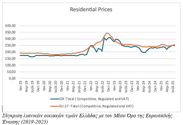Ενδιαφέρον παρουσιάζει επίσης η σύγκριση με τις άλλες χώρες της ΕΕ, από την οποία προκύπτει ότι η Ελλάδα είναι σταθερά τα τελευταία χρόνια κάτω από τον ευρωπαϊκό μέσο όρο των τιμών λιανικής. Μεσοσταθμικά, η Ελλάδα είναι 16η μεταξύ των 27 ενώ από τον Ιανουάριο του 2024 και μετά είναι συχνά σε ακόμα χαμηλότερη θέση.