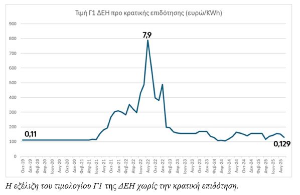 -Οι τιμές λιανικής επίσης επανέρχονται σταδιακά στα προ κρίσης επίπεδα ακολουθώντας τις διακυμάνσεις και την εποχικότητα των τιμών χονδρικής. Για παράδειγμα, το τιμολόγιο που έχει τους περισσότερους πελάτες σήμερα στη χώρα, το πράσινο Γ1 της ΔΕΗ, είναι σήμερα στα 0,129 €/KWh, ενώ η τιμή προ κρίσης ήταν 0,11 €/KWh. Στο υψηλότερο σημείο της κρίσης είχε φτάσει μέχρι και τα 7,9 €/KWh, τιμή που δεν έφθασε στους τελικούς καταναλωτές λόγω των μέτρων στήριξης που εφάρμοσε η κυβέρνηση και της αυτοσυγκράτησης των παρόχων. Ειδικά η ΔΕΗ απορρόφησε μεγάλο μέρος των αυξήσεων μέσω εκπτώσεων, συνολικής δαπάνης 2,4 δισ. ευρώ. Έτσι οι καταναλωτές δεν βίωσαν τον πλήρη αντίκτυπο των πάρα πολύ υψηλών τιμών χονδρικής κατά τη διάρκεια της κρίσης.