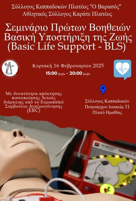 Ο Σύλλογος Καππαδοκών Πλατέος «Ο Βαρασός», σε συνεργασία με τον Αθλητικό Σύλλογο Καράτε Πλατέος, προσκαλούν όποιον ενδιαφέρεται να συμμετέχει σε πιστοποιημένο Σεμινάριο Βασικής Υποστήριξης Ζωής (Basic Life Support – BLS/AED), την Κυριακή 16 φεβρουαρίου 2025 και ώρες 15:00 μ.μ. – 20:00 μ.μ.