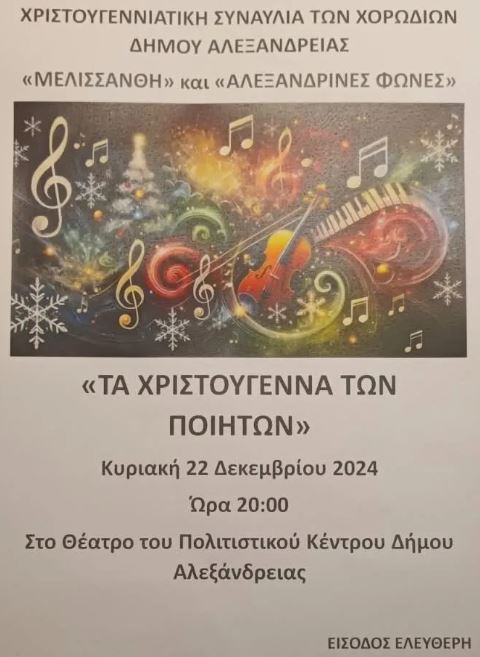 Σας προσκαλούμε στην επίσημη Χριστουγεννιάτικη Συναυλία των Χορωδιών του Δήμου Αλεξάνδρειας (Μελισσάνθη και Αλεξανδρινές Φωνές) «ΤΑ ΧΡΙΣΤΟΥΓΕΝΝΑ ΤΩΝ ΠΟΙΗΤΩΝ», την Κυριακή 22 Δεκεμβρίου 2024, στις 8 μ.μ., στο Θέατρο του Πολιτιστικού Κέντρου της πόλης μας.