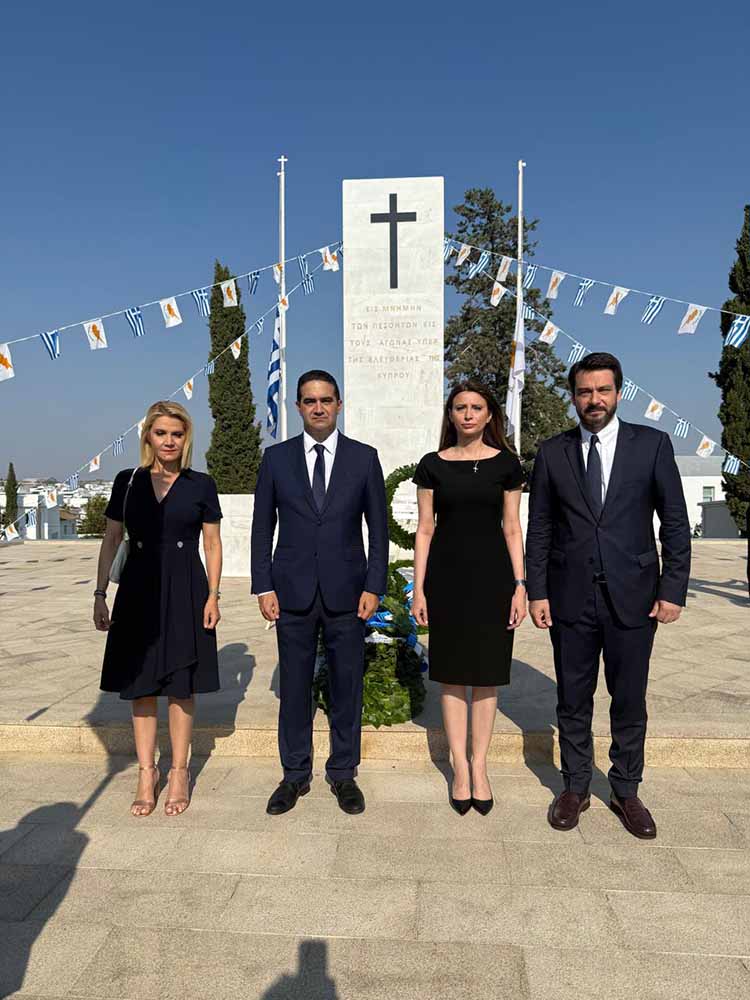 Παρουσία του Προέδρου της Κυπριακής Δημοκρατίας, Α.Ε. κ. Νίκου Χριστοδουλίδη, και σε κλίμα βαθιάς συγκίνησης, αποδόθηκε φόρος τιμής στους πεσόντες υπερασπιστές της ελευθερίας. Στη συνέχεια, η ελληνική αντιπροσωπεία έγινε δεκτή από τον Μακαριώτατο Αρχιεπίσκοπο Κύπρου και Νέας Ιουστινιανής, κ. Γεώργιο, σε μια συνάντηση με έντονο συμβολισμό και εγκάρδιο κλίμα.