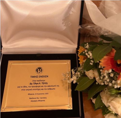 Την τιμητική πλακέτα, της επέδωσε ο Πρόεδρος του Δημοτικού Συμβουλίου Φλώρινας κ. Κωνσταντίνος Μαραγγός, που επεσήμανε στο ΑΠΕ-ΜΠΕ πως «ήταν το λιγότερο που θα μπορούσε να κάνει ο δήμος για την προσφορά της και το έργο της.