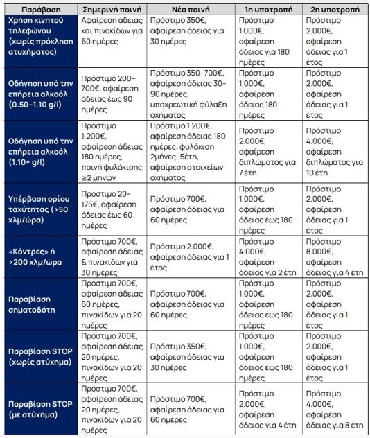Στο πλαίσιο αυτό, σύμφωνα με κυβερνητικές πηγές, καθιερώνεται κλιμακωτού χαρακτήρα ποινολόγιο, ώστε να επιβάλλονται αυστηρότερες συνέπειες σε υπότροπους, οι οποίοι επαναλαμβάνουν σοβαρά παραπτώματα, ενώ υπάρχουν και πρόνοιες για αυξημένες κυρώσεις στην περίπτωση που ο παραβάτης εμπλακεί σε ατύχημα.