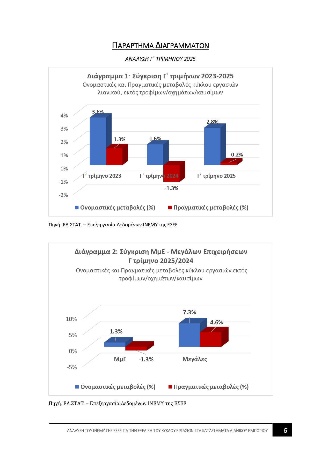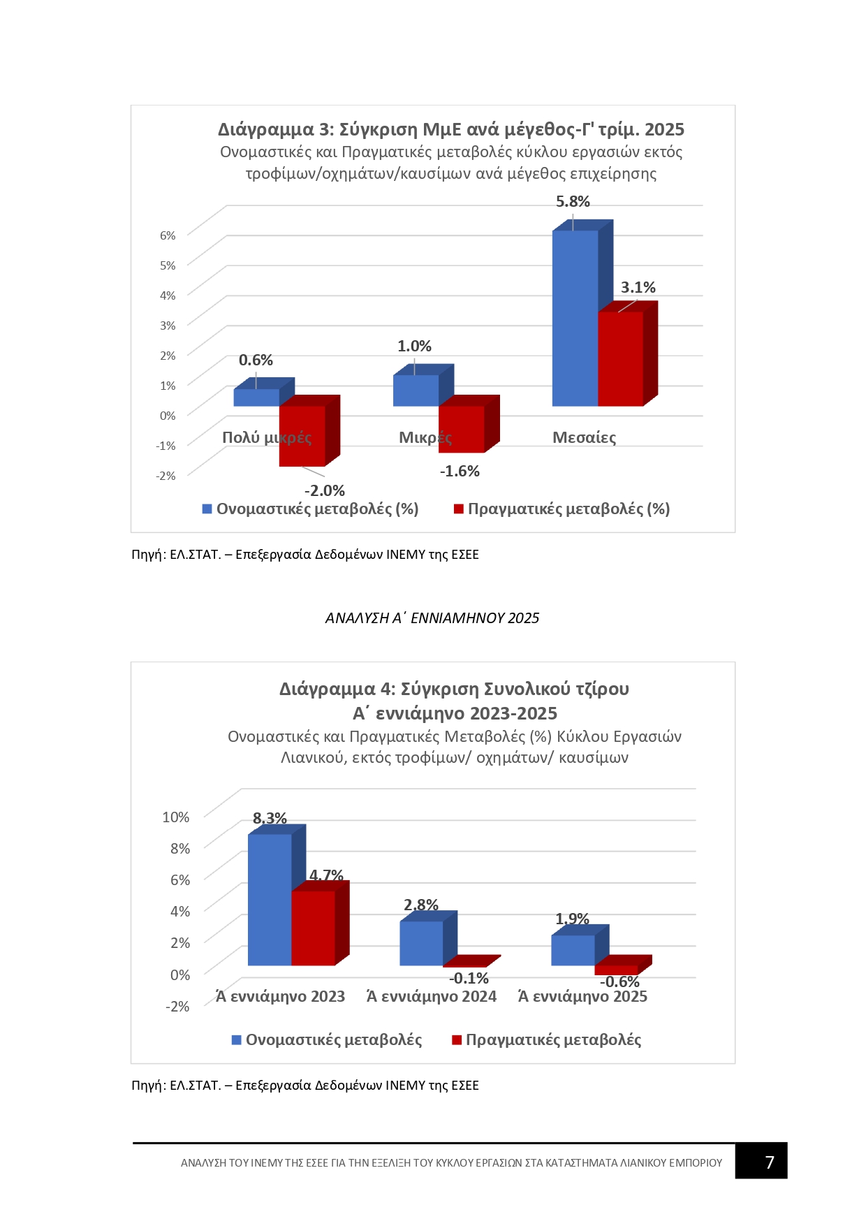 • Ο ρυθμός ενίσχυσης του τζίρου κατά το Γ΄ τρίμηνο του 2025 ανήλθε σε 2,8% συγκριτικά με το ίδιο τρίμηνο του 2024, σχεδόν όσο και ο ρυθμός πληθωρισμού για το αντίστοιχο χρονικό διάστημα. Αυτό σημαίνει πως η αύξηση του πραγματικού όγκου πωλήσεων ήταν μηδαμινή.