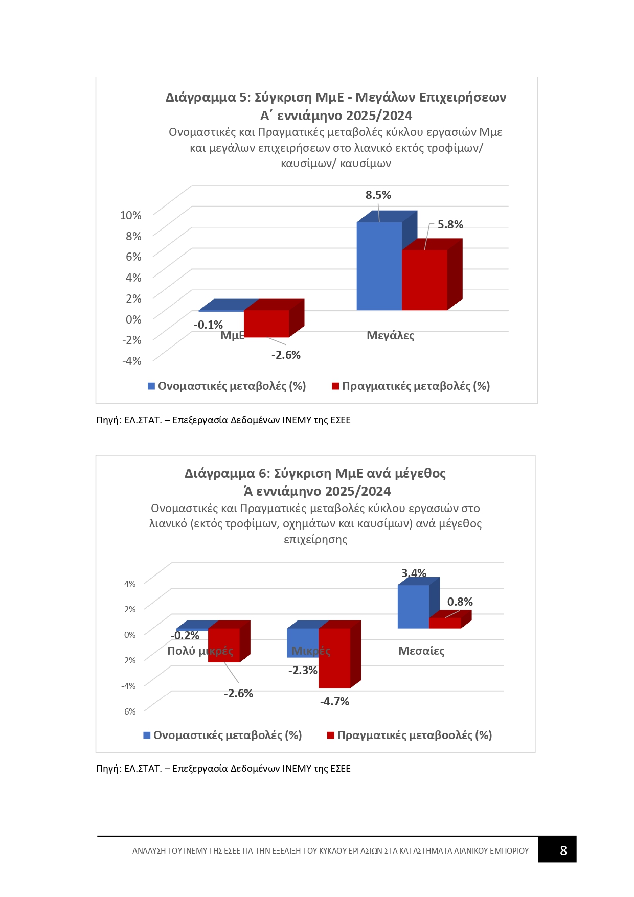 • Οι μικρές επιχειρήσεις φαίνεται να πιέζονται περισσότερο καθώς υποχώρηση των πωλήσεων (-2,3%) καταγράφηκε ακόμα και σε ονομαστικές τιμές.